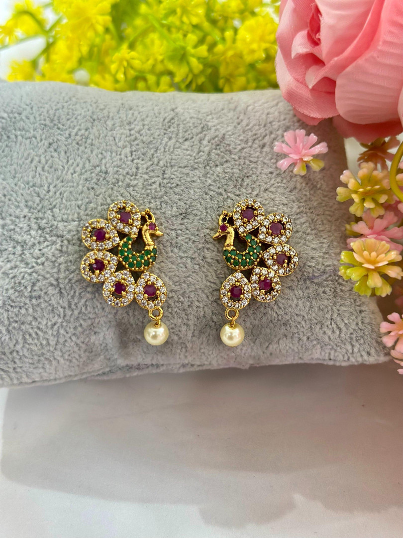 Stunning peacock-inspired earrings adorned with sparkling CZ stones, ruby-red highlights, and green detailing. The design is finished with an elegant pearl drop, making it a perfect blend of traditional artistry and modern sparkle.