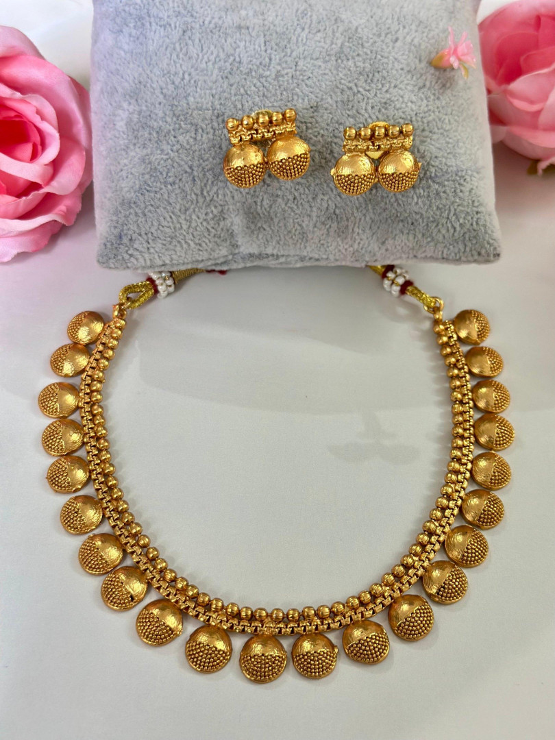 This traditional gold-tone necklace set features intricately designed round coin-like motifs, inspired by the classic Kasu Mala style. The textured finish and beaded detailing add a vintage charm, while the matching earrings complete the ethnic look. Ideal for temple wear, bridal functions, or cultural celebrations.