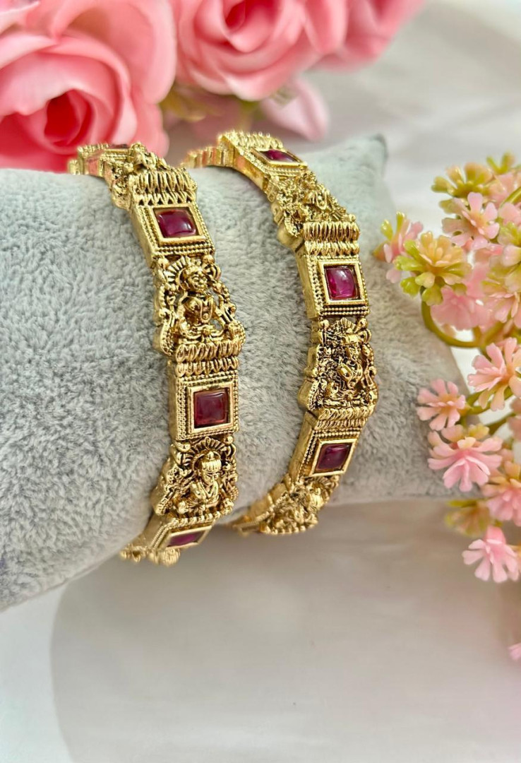 A pair of traditional temple-style bangles featuring divine Lakshmi motifs and studded with striking ruby-red kemp stones. Crafted with intricate antique gold detailing, these bangles exude a rich cultural heritage and are perfect for bridal wear, weddings, and festive occasions. They symbolize prosperity, blessings, and timeless elegance.