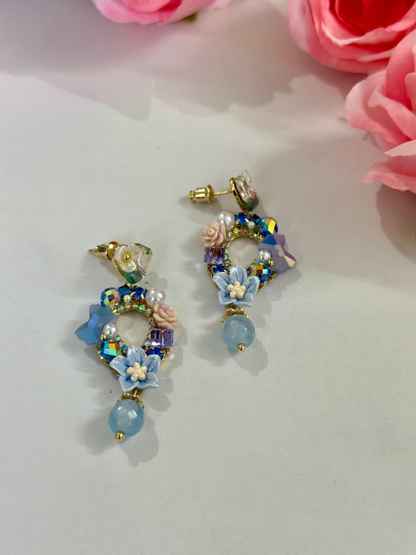 These romantic drop earrings are adorned with a medley of pastel-toned flowers, sparkling crystals, and tiny pearls arranged in a heart-shaped frame. Finished with a pink gemstone bead at the bottom, they evoke the softness of a blooming spring garden. Perfect for a whimsical, feminine look.