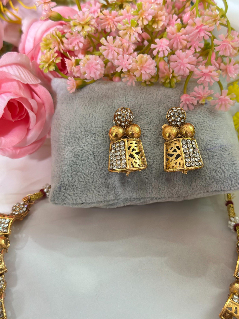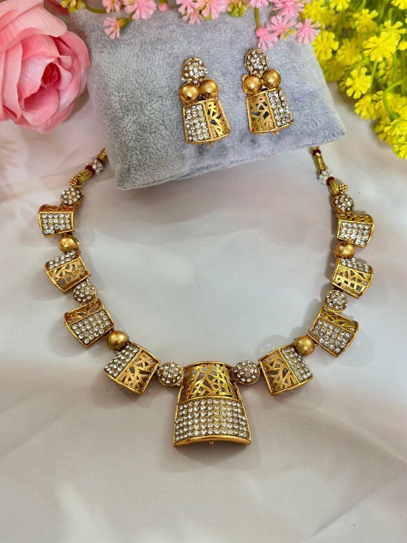 A contemporary gold-finish necklace featuring uniquely shaped segments adorned with sparkling white stones and intricate cutwork designs. The bold geometric motifs give it a modern yet elegant appeal, perfect for parties and special occasions.