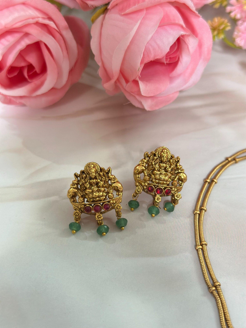 An elegant temple-style necklace featuring a detailed Goddess Lakshmi pendant seated on a lotus, flanked by peacocks. The pendant is embellished with red and green stones and green bead hangings, paired with a simple dual-string gold-finish chain for a graceful traditional look.