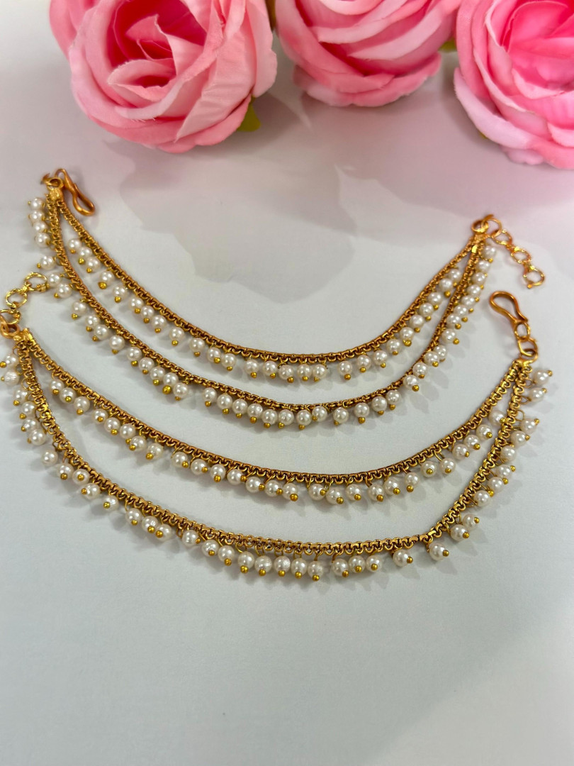 Elegant and traditional, this Double Layer Pearl Mattal features two delicate golden chains adorned with clusters of miniature pearl drops. Perfect for enhancing the beauty of jhumkas or other ethnic earrings, this mattal adds a graceful, royal touch to bridal and festive looks. Lightweight yet luxurious, it's a must-have for traditional South Indian or bridal styling.