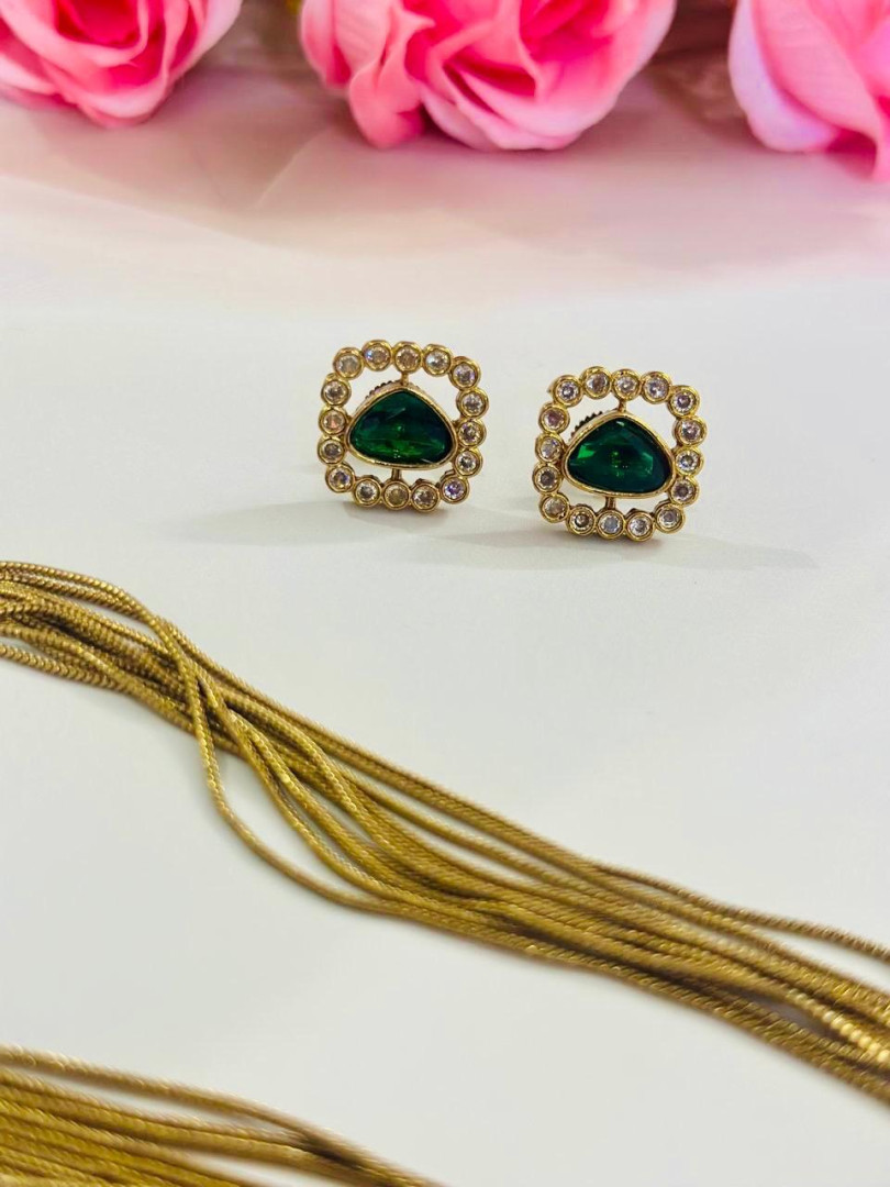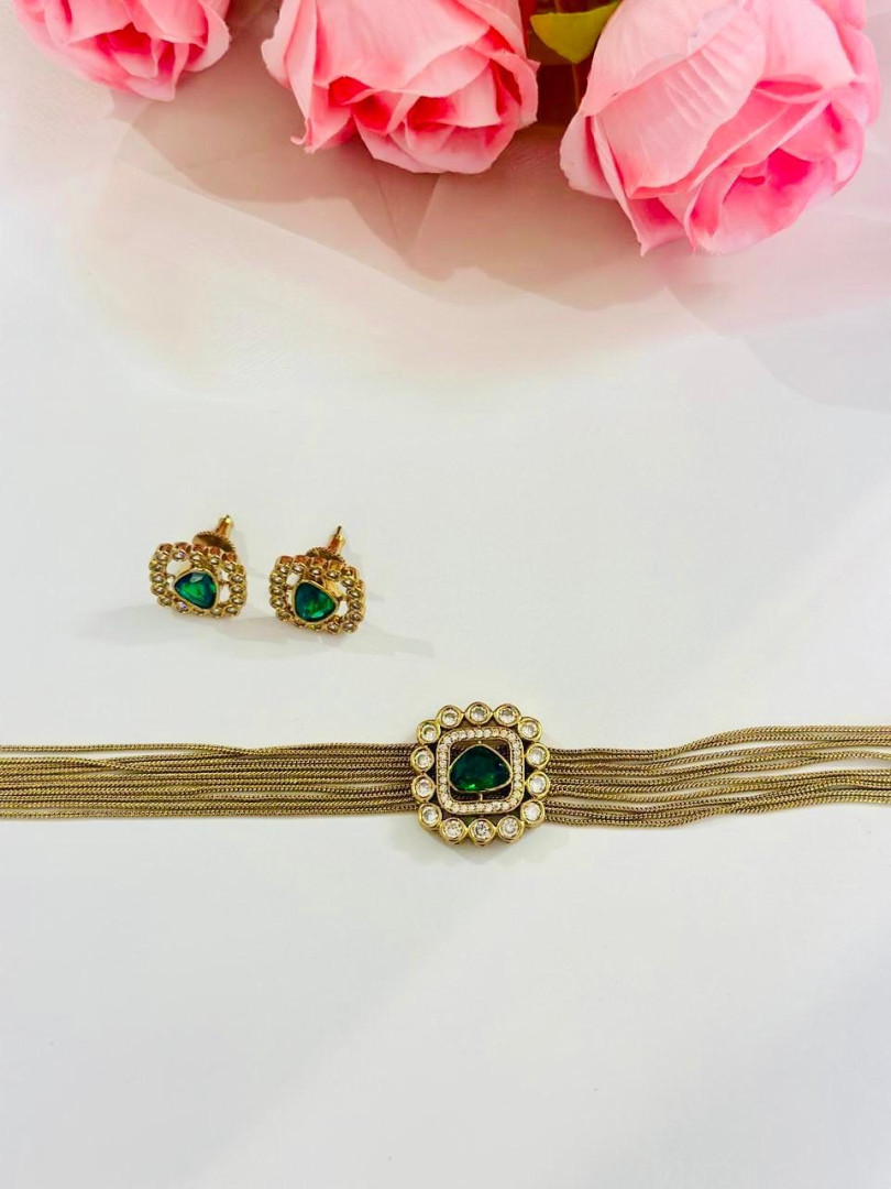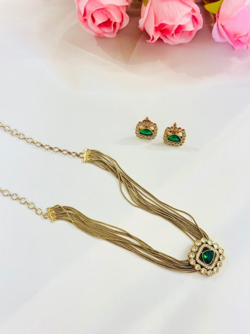 An exquisite multi-layered necklace featuring a deep emerald green centerpiece surrounded by shimmering stones and paired with matching studs. The timeless blend of gold tones and emerald hues makes it perfect for festive occasions and elegant evening wear.
