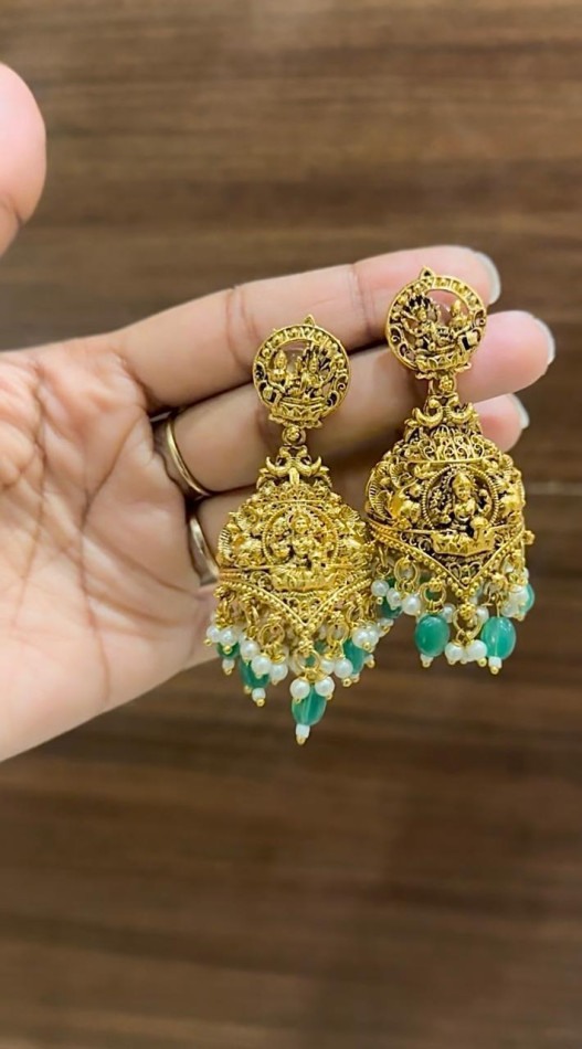 A stunning traditional temple-style jhumka crafted in antique gold finish, featuring intricate goddess motifs and adorned with green and white bead drops. This masterpiece reflects timeless South Indian artistry — perfect for weddings, festive occasions, and cultural celebrations.