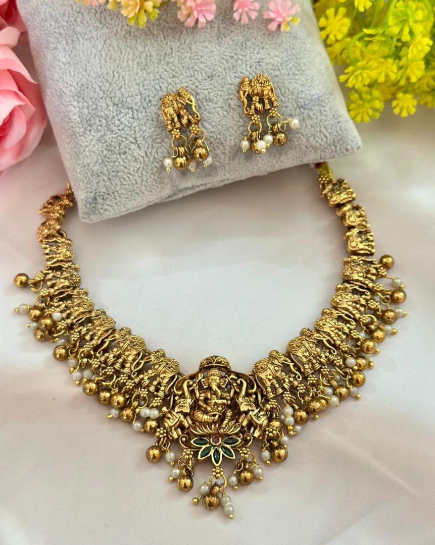 An antique temple-style necklace showcasing Lord Ganesha seated on a lotus, surrounded by intricately carved elephants. Enhanced with pearl drops and fine detailing, this piece embodies blessings, prosperity, and timeless traditional charm.