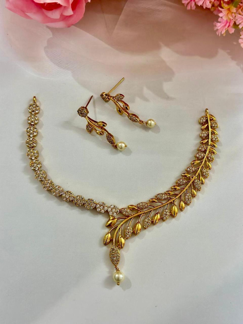 This exquisite necklace set showcases a graceful leaf-inspired design, adorned with shimmering cubic zirconia and finished in rich gold tones. The delicate pearl drop adds a touch of timeless charm and sophistication. Perfect for weddings and festive occasions, it beautifully complements both traditional and modern outfits.