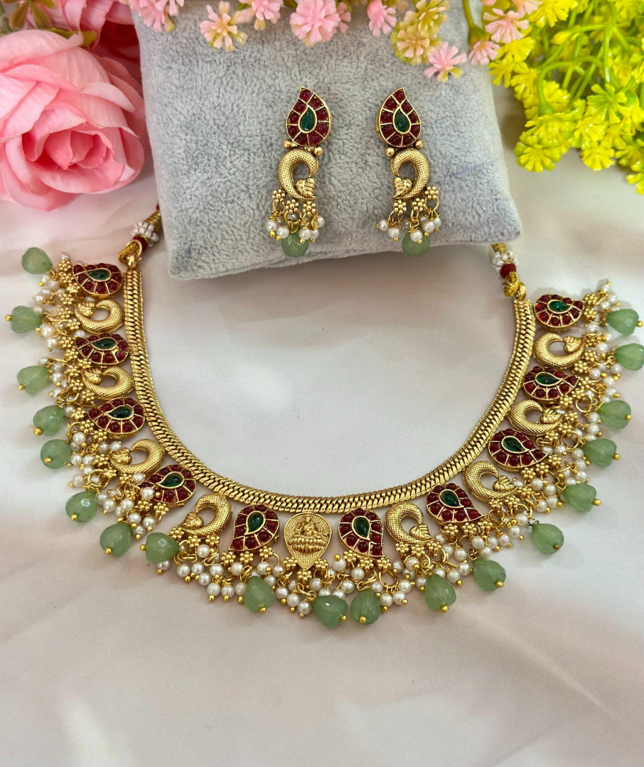 A traditional Guttapusalu necklace, designed with peacock motifs and embellished with red and green stones. The necklace is adorned with clusters of pearls and green bead drops, giving it the signature guttapusalu style. Paired with matching earrings, this set is a timeless choice for weddings, temple jewellery collections, and festive occasions.