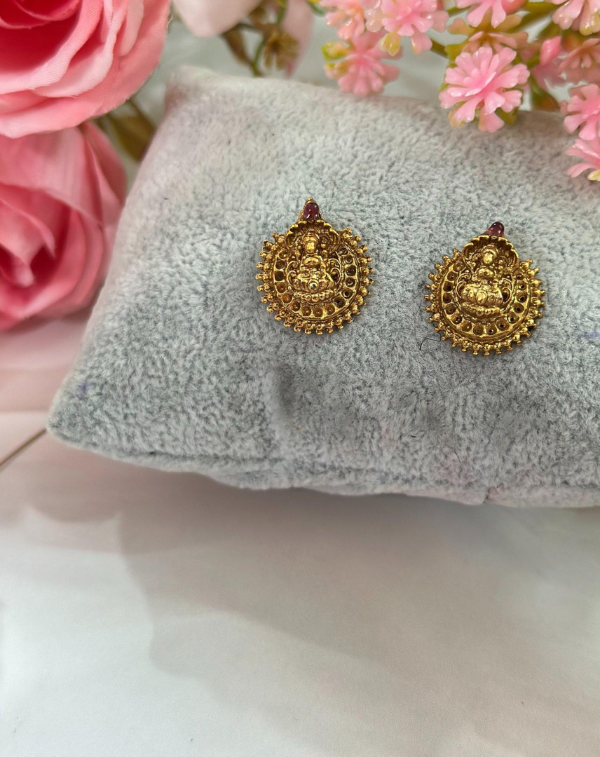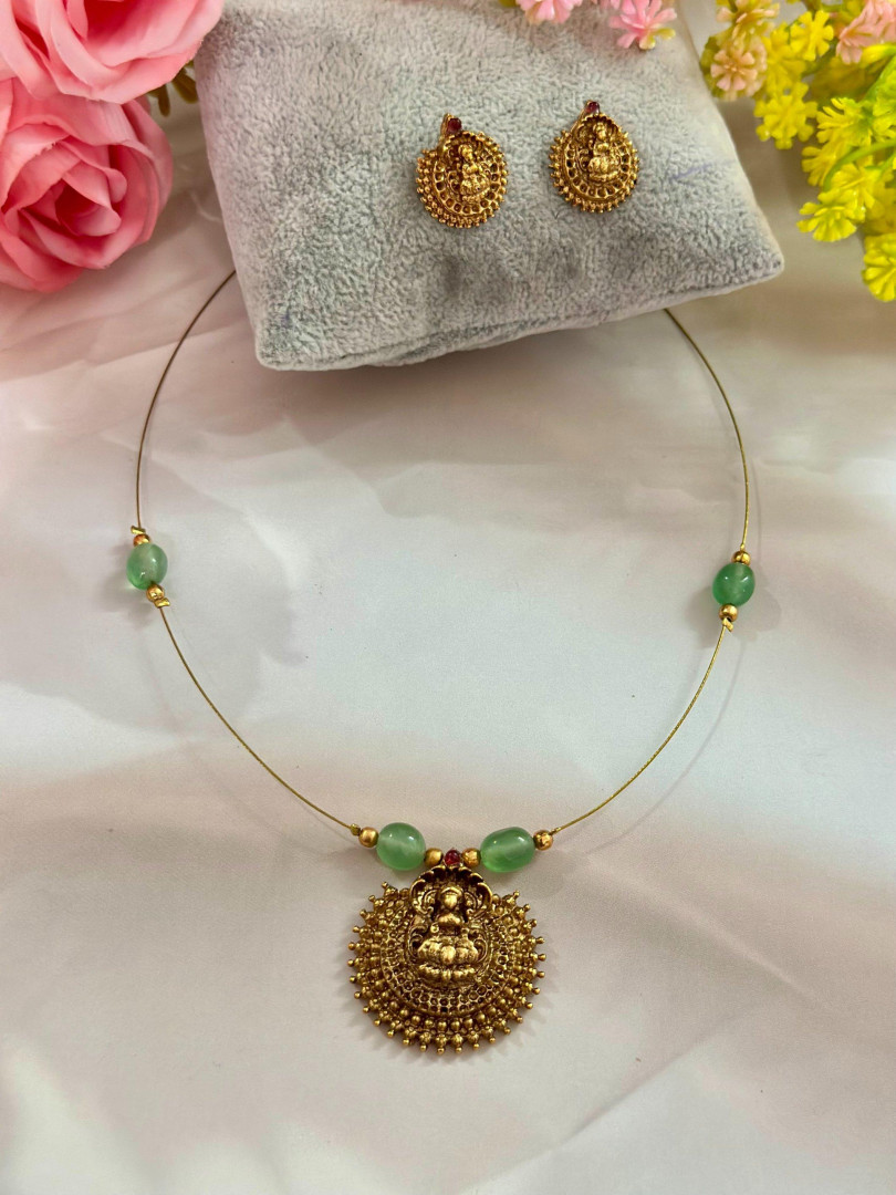 A delicate gold-finish necklace featuring a round Lakshmi pendant with intricate detailing, strung on a thin chain with green and red beads. Its minimal yet traditional design makes it perfect for festive wear and everyday elegance.
