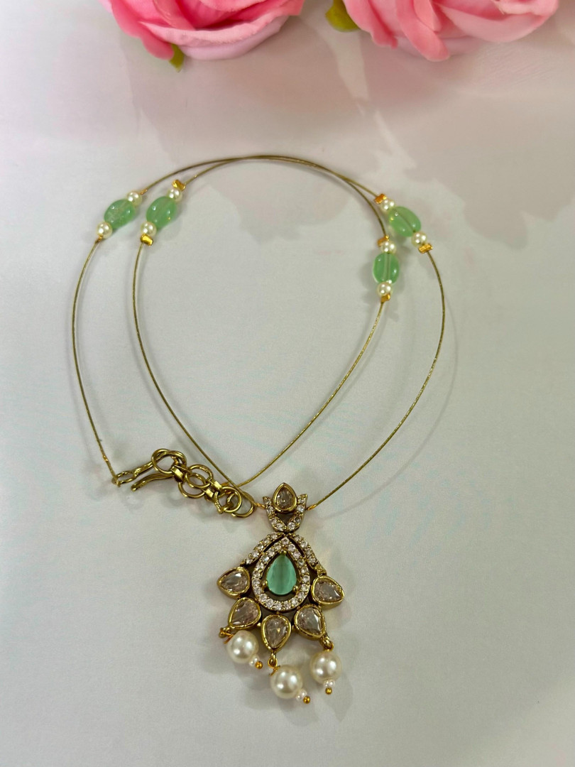 A graceful golden thread necklace featuring mint-green beads and a teardrop-shaped pendant embellished with kundan work and pearl danglers. Elegant and lightweight—perfect for festive and ethnic occasions.