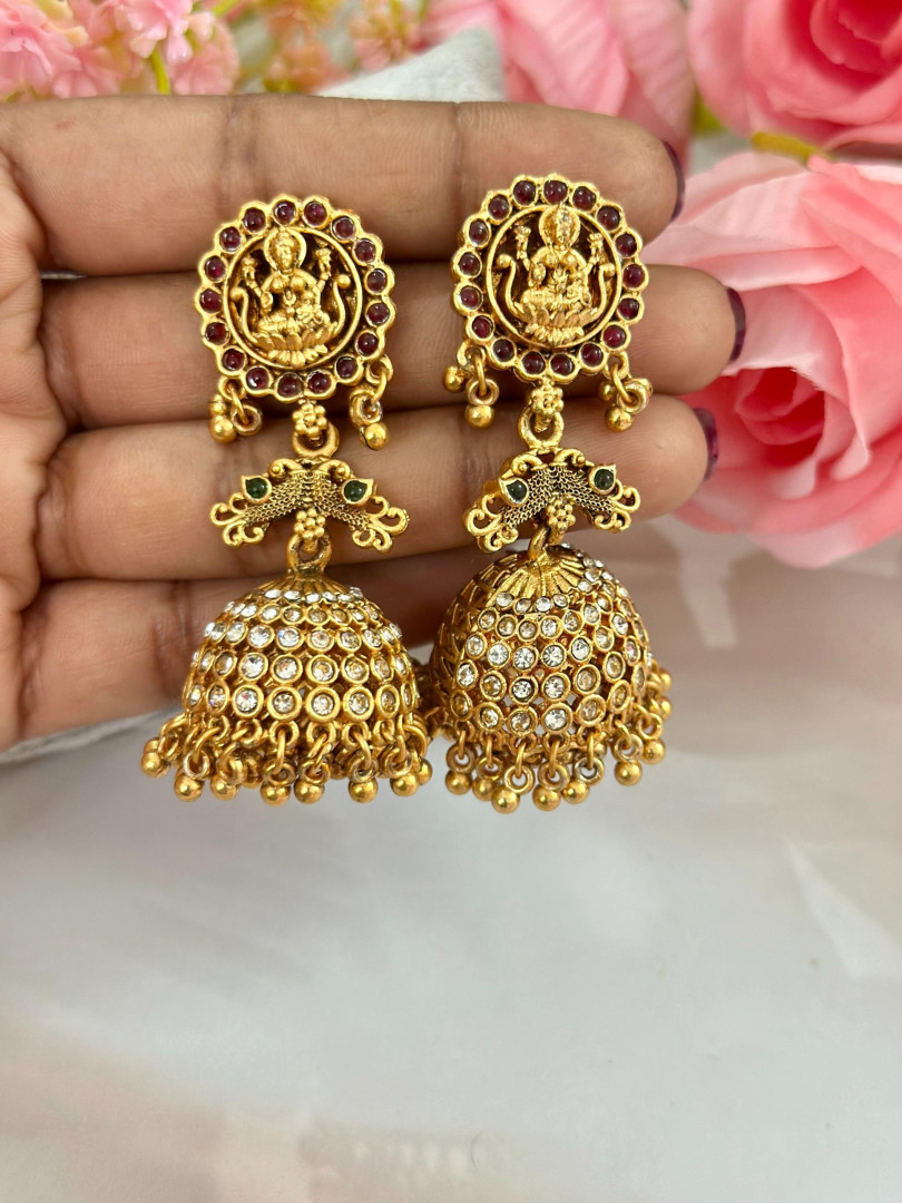 An elegant temple-style jhumka showcasing Goddess Lakshmi on the stud, bordered with ruby-red stones. The design features intricate peacocks and a sparkling dome studded with CZ stones, finished with golden bead drops, making it a perfect blend of tradition and festive charm.