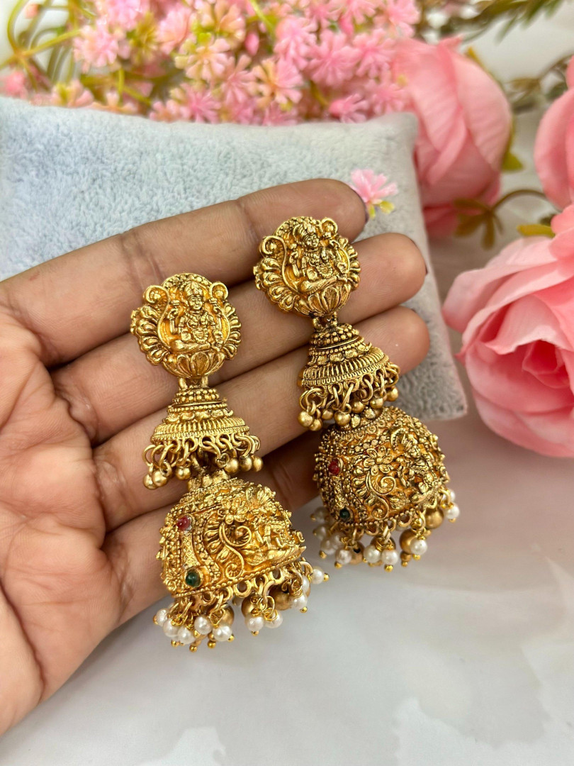 A divine double-layer temple jhumka showcasing Goddess Lakshmi on the stud, adorned with intricate carvings, ruby–emerald accents, and cascading pearl drops. The layered design adds extra grandeur, making it ideal for festive and bridal wear.