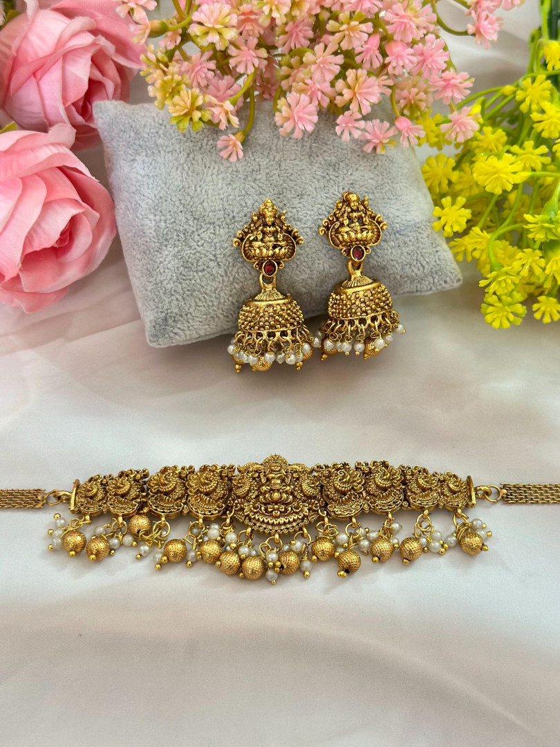 An antique gold choker intricately designed with Lakshmi motifs, adorned with golden beads and pearl danglings for a royal touch. Paired with matching Lakshmi-styled jhumkas embellished with ruby stones and pearls, this temple jewelry set is an ideal choice for brides and festive occasions, adding grace and tradition to any look.