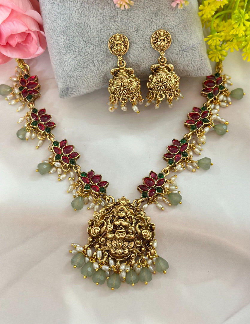 A traditional temple-style necklace featuring a central Lakshmi pendant symbolizing prosperity and blessings. The chain is beautifully adorned with red and green stone lotus motifs, finished with pearl and bead danglings for added grace. The matching antique gold jhumkas with intricate carvings complete the set, making it perfect for weddings, festive occasions, and bridal wear.