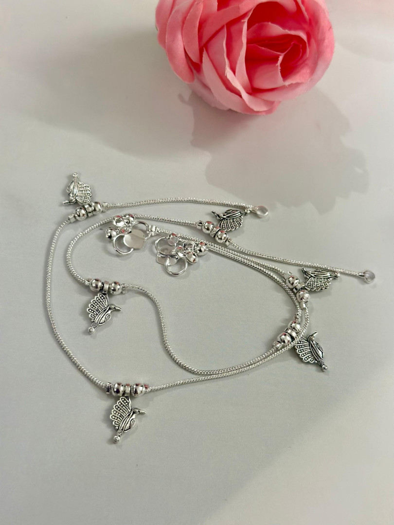 This beautiful anklet set features a sleek silver-tone chain adorned with delicate peacock-shaped charms and polished beads, offering a graceful and traditional look. The minimalist design with intricately carved bird motifs adds a playful yet ethnic touch, perfect for daily wear or festive occasions. Lightweight and charming, it brings a touch of elegance and cultural symbolism to your every step.