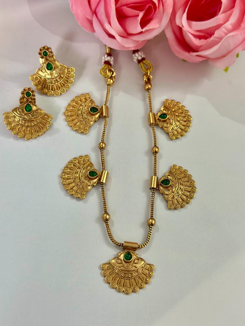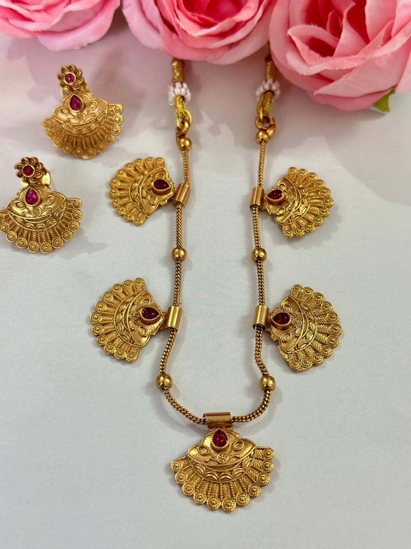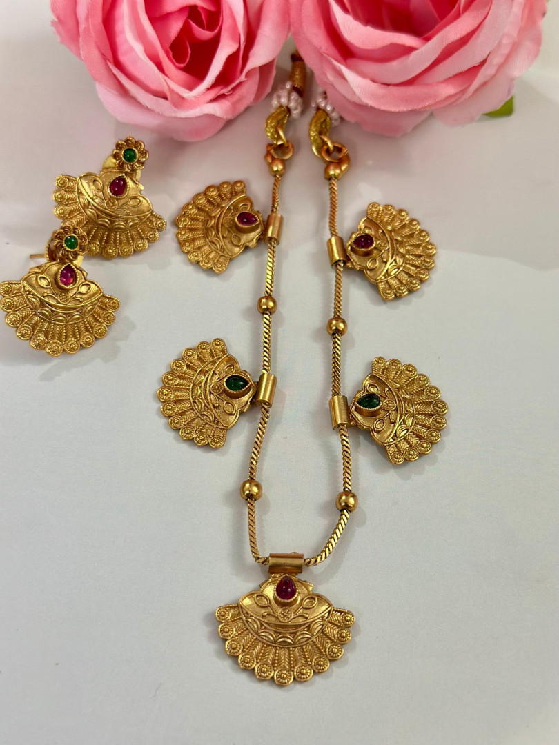This exquisite temple-style necklace set features intricate fan-shaped gold pendants adorned with ruby and emerald-colored stones. The detailed craftsmanship and traditional design make it a perfect accessory for festive events, classical performances, or bridal attire. Matching earrings complete the graceful ethnic look.