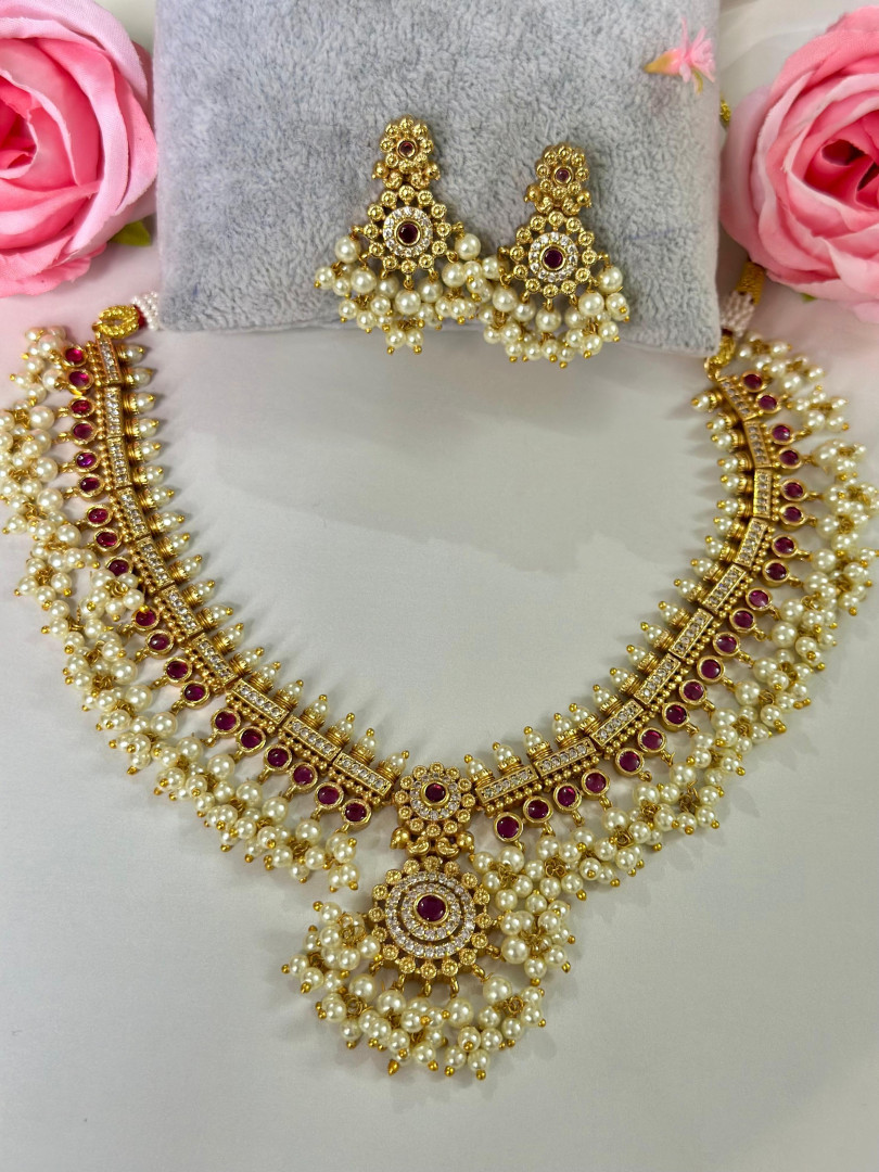 The Pearl Rajnandini Set is a graceful ode to royalty and timeless femininity. Featuring a stunning blend of radiant ruby-toned stones, delicate pearl clusters, and intricate gold-finish detailing, this necklace exudes traditional charm with modern elegance. The circular pendant design paired with coordinated earrings creates a regal silhouette — perfect for weddings, festivals, or heritage occasions.