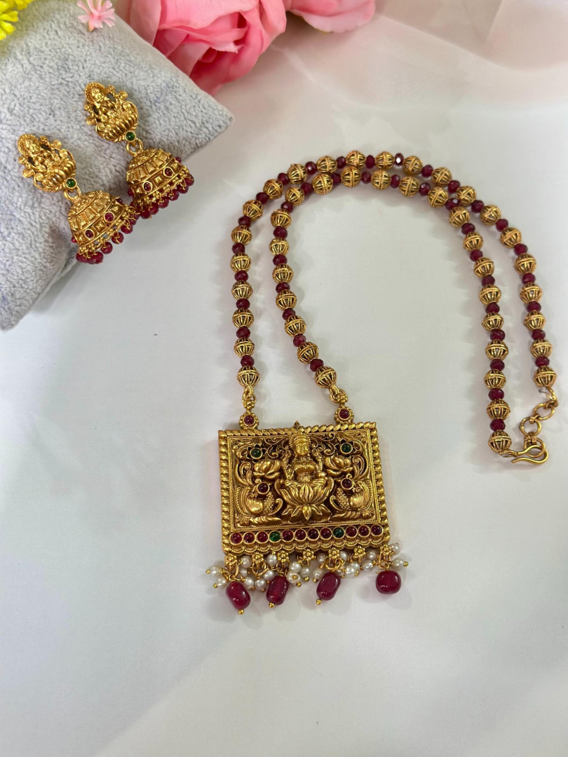 A traditional South Indian Lakshmi Kasu Haram, crafted in antique gold finish with a rectangular pendant depicting Goddess Lakshmi seated on a lotus, symbolizing wealth and prosperity. The haram is beautifully adorned with red ruby beads, green stone accents, and delicate pearl drops. The matching Lakshmi jhumkas with ruby bead hangings complete the set, making it a perfect choice for bridal and festive wear.