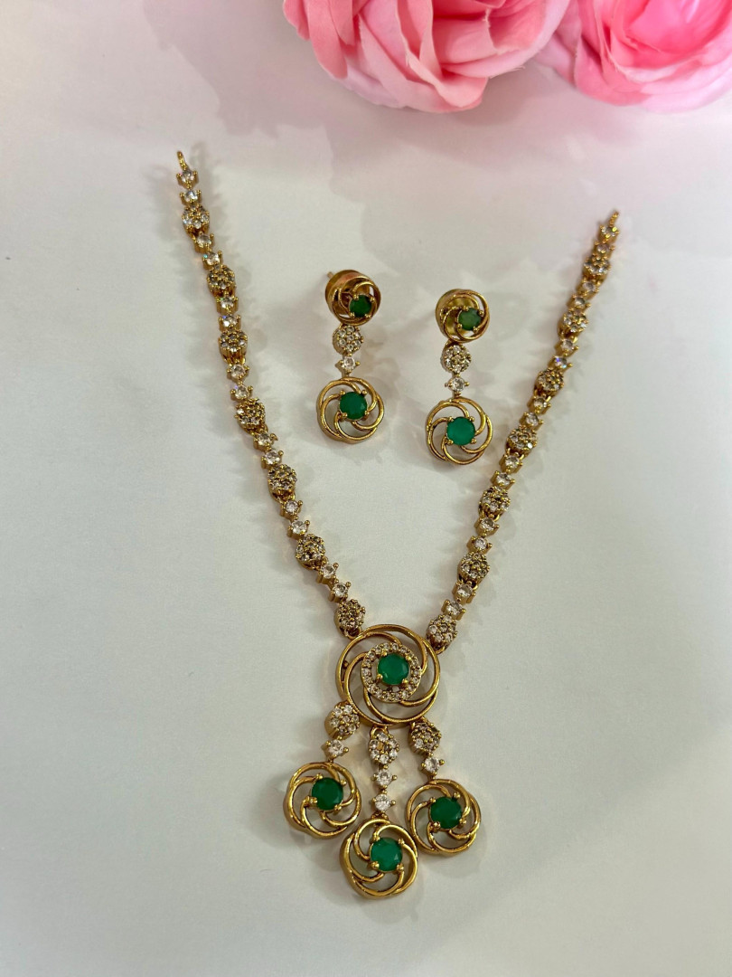 This exquisite AD necklace set showcases a floral swirl design with sparkling cubic zirconia and vivid green stones. The gold-toned base, combined with the hanging floral pendants and matching earrings, creates a graceful and festive look—ideal for weddings and traditional events.