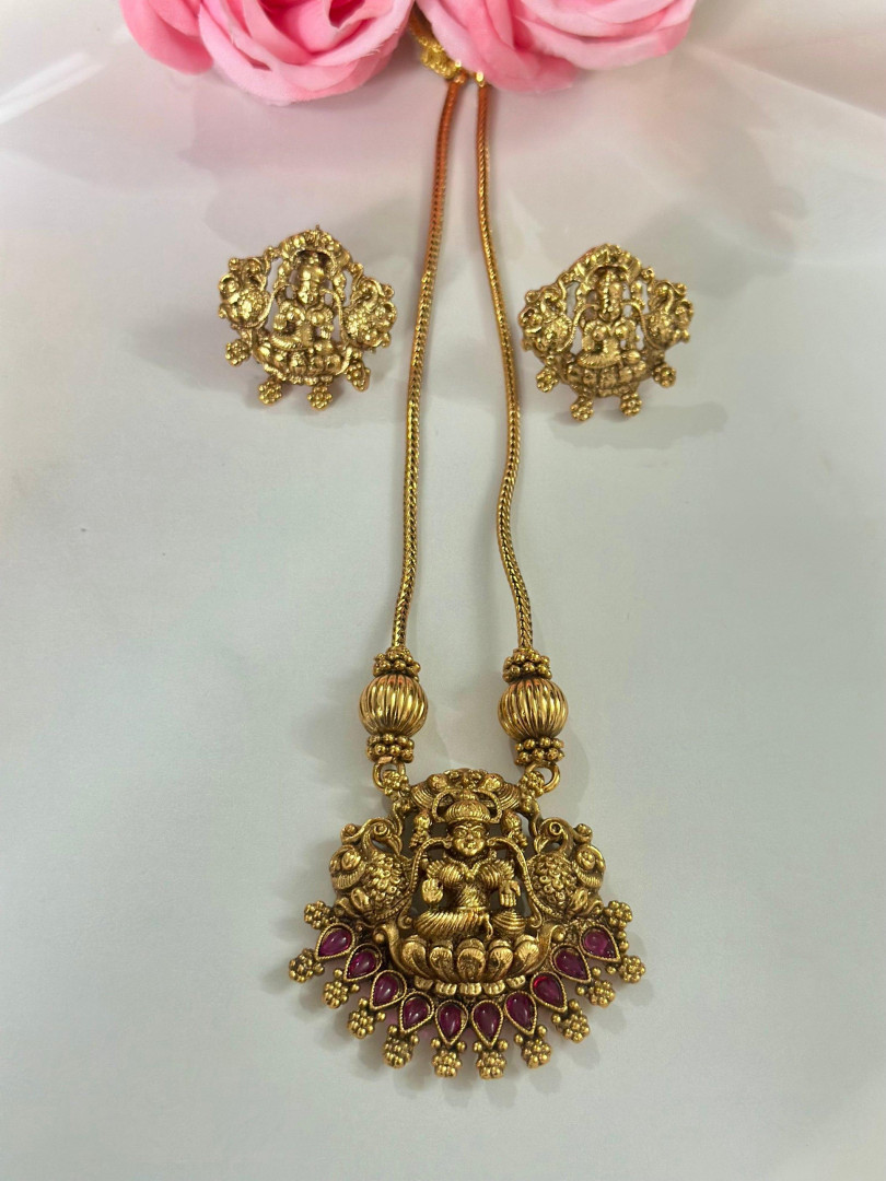 Temple-style necklace featuring a detailed pendant of Goddess Lakshmi flanked by two majestic elephants (Gaja Lakshmi), symbolizing abundance and auspiciousness. Accented with ruby-red stones along the bottom edge, the pendant adds a vibrant touch to the antique gold finish. The sleek rope-style chain enhances its elegance, and the matching earrings reflect the same sacred motif, making it perfect for traditional functions, poojas, or festive wear. This piece beautifully blends devotion with timeless artistry.