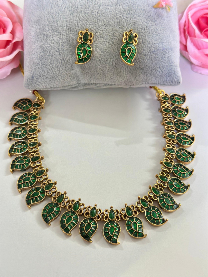 Kerala traditional and graceful, the Mangamala necklace features a classic design adorned with mango-shaped motifs, symbolizing prosperity and beauty. Often crafted in gold or gold-plated finishes, it’s a timeless piece perfect for weddings and cultural celebrations.