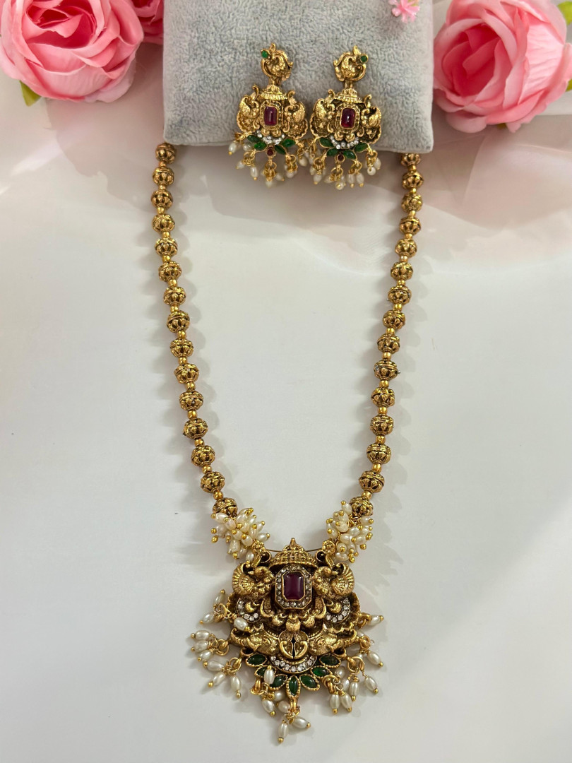 Graceful and traditional, this Temple Lakshmi haram features a beautifully detailed goddess Lakshmi pendant adorned with a central ruby stone, green accents, and delicate pearl drops. The antique gold-finished chain is embellished with floral beads, making it a perfect choice for weddings, temple functions, and festive occasions. Matching earrings enhance its divine charm.