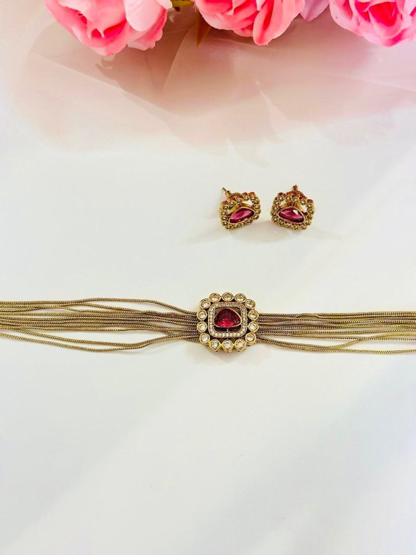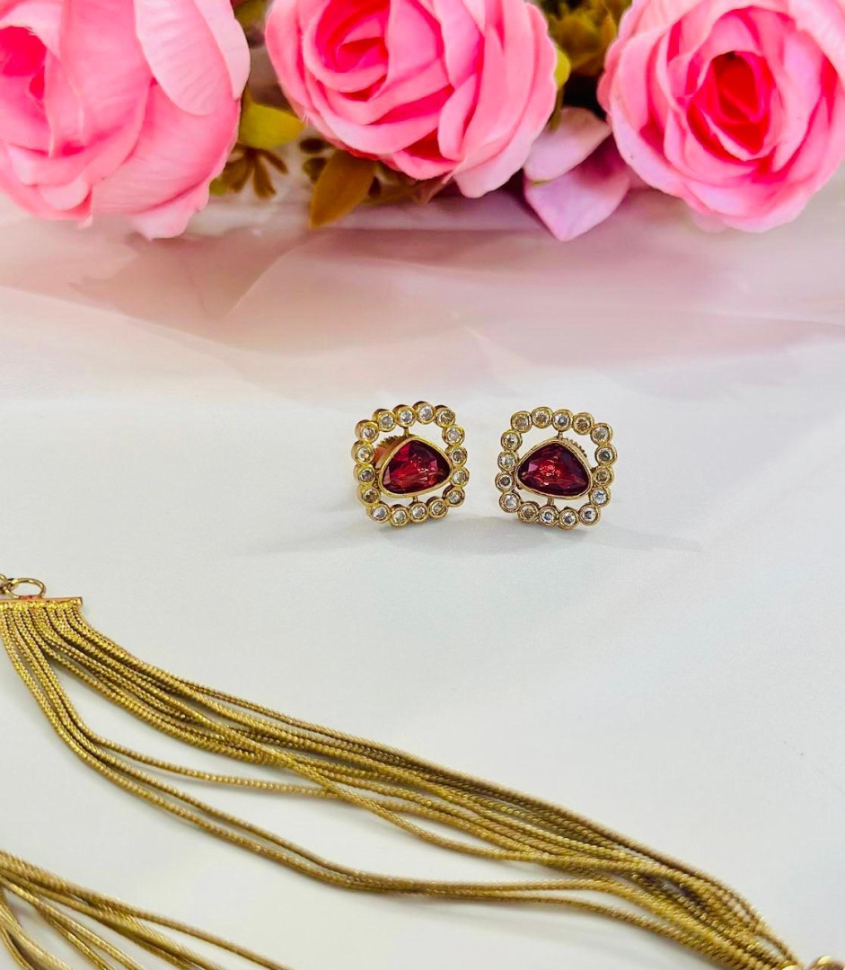 A stunning layered chain necklace adorned with a radiant ruby-toned centerpiece and bordered with delicate pearl accents. Paired with matching ruby studs, this elegant set adds a touch of royal charm and sophistication — perfect for festive and evening wear.