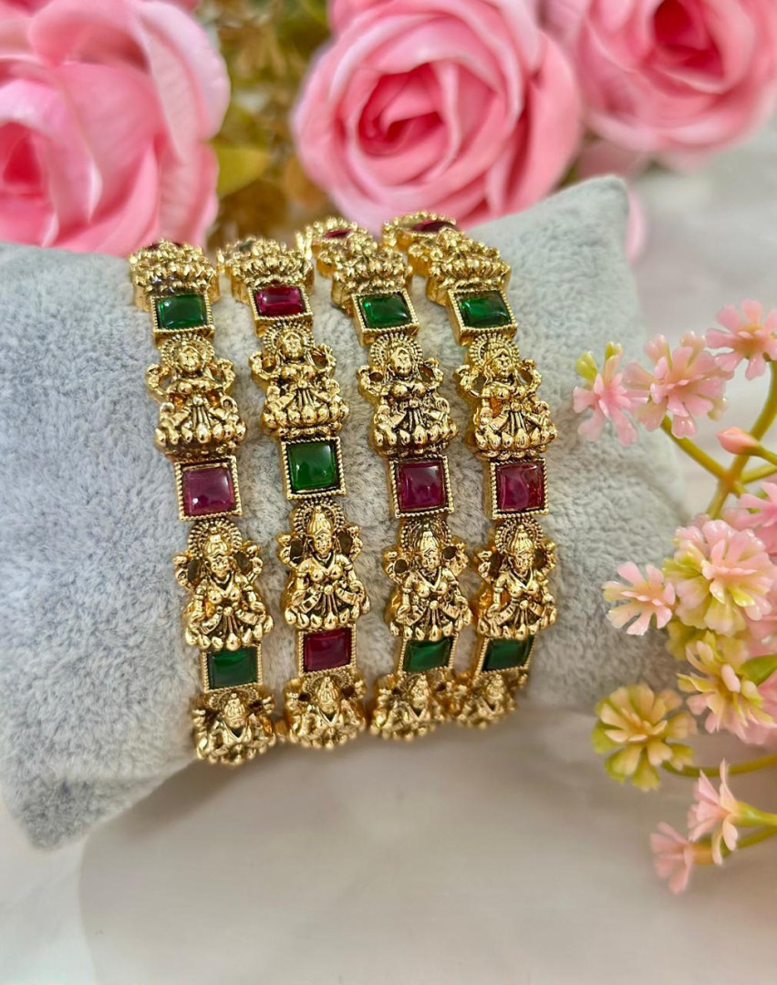A grand pair of antique-finish gold bangles adorned with beautifully carved Lakshmi motifs, symbolizing wealth and prosperity. The design is enhanced with alternating red and green square kemp stones, giving the bangles a rich and traditional South Indian temple jewelry look. Perfect for bridal wear, festive occasions, and cultural celebrations, these bangles exude divinity and regal charm.