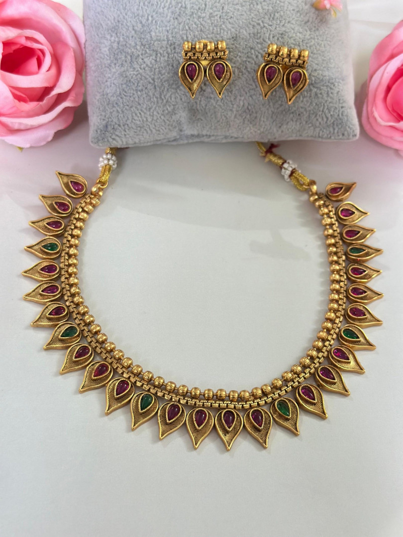 This elegant Short Necklace-Ruby and Emerald mix features a traditional South Indian design with alternating ruby and emerald-colored mango-shaped motifs. The intricate gold bead detailing adds a rich, antique touch, while the matching earrings complete the set with divine symmetry. Perfect for festive wear, weddings, and classical events, this piece beautifully blends heritage with timeless grace.